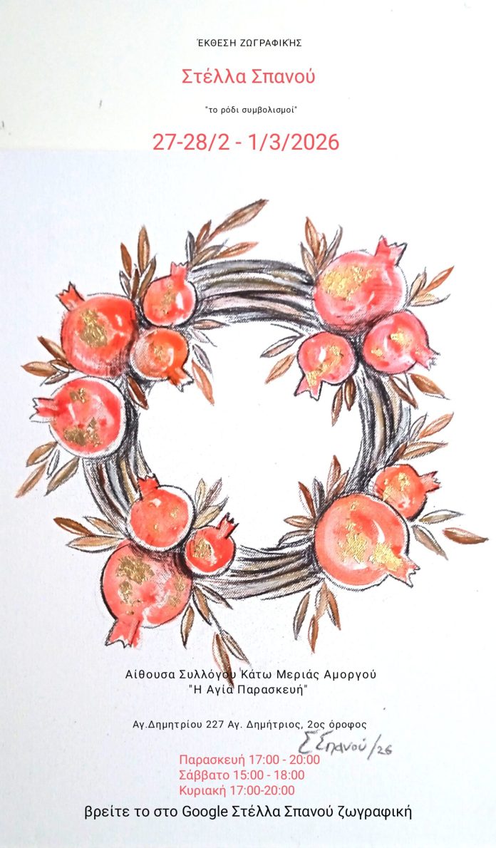 Η ατομική έκθεση ζωγραφικής της Αρχιτέκτονος εικαστικού Στέλλας Σπανού με θέμα ” το ρόδι συμβολισμοί” μεταφέρθηκε  στην Αίθουσα του Συλλόγου Κάτω Μεριάς Αμοργού “Η Αγία Παρασκευή” για μια τελευταία φορά για φέτος.