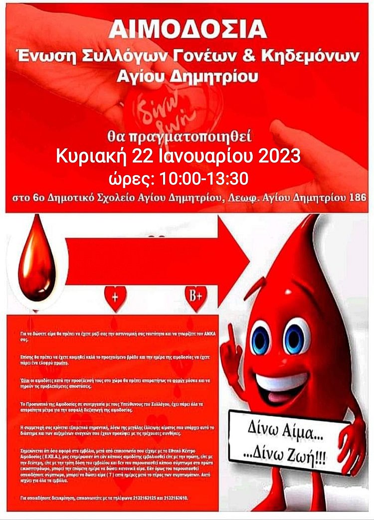 ΔΗΜΟΣΕΙΔΗΣΕΙΣ Δράση εθελοντικής αιμοδοσίας της Ένωσης Συλλόγων Γονέων & Κηδεμόνων Αγίου Δημητρίου 17 Ιανουαρίου 2023 387 Facebook Google+ Η Ένωση Συλλόγων Γονέων & Κηδεμόνων Αγίου Δημητρίου διοργανώνει αιμοδοσία την Κυριακή 22-1-2023, από ώρα 10:00 έως 13:30, στο 6ο Δημοτικό Σχολείο (Αγίου Δημητρίου 186).
