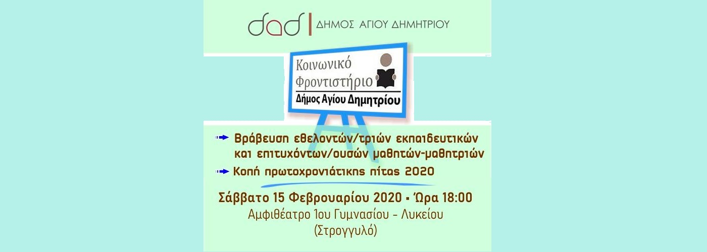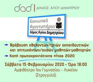 Μια ξεχωριστή εκδήλωση διοργανώνει το Κοινωνικό Φροντιστήριο του Δήμου το Σάββατο 15 Φεβρουαρίου, στις 18:00, στο αμφιθέατρο 1ου Γυμνασίου – Λυκείου Αγ. Δημητρίου (Παπάγου & Καλλιθέας). Κατά τη διάρκεια της εκδήλωσης θα γίνει απονομή τιμητικών διακρίσεων στους εθελοντές καθηγητές της σχολικής χρονιάς 2018 -2019 και σε όλους τους μαθητές που πέτυχαν την εισαγωγή τους σε Ανώτατα Εκπαιδευτικά Ιδρύματα της χώρας στις Πανελλήνιες Εξετάσεις 2019.