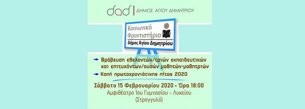 Μια ξεχωριστή εκδήλωση διοργανώνει το Κοινωνικό Φροντιστήριο του Δήμου το Σάββατο 15 Φεβρουαρίου, στις 18:00, στο αμφιθέατρο 1ου Γυμνασίου – Λυκείου Αγ. Δημητρίου (Παπάγου & Καλλιθέας). Κατά τη διάρκεια της εκδήλωσης θα γίνει απονομή τιμητικών διακρίσεων στους εθελοντές καθηγητές της σχολικής χρονιάς 2018 -2019 και σε όλους τους μαθητές που πέτυχαν την εισαγωγή τους σε Ανώτατα Εκπαιδευτικά Ιδρύματα της χώρας στις Πανελλήνιες Εξετάσεις 2019.