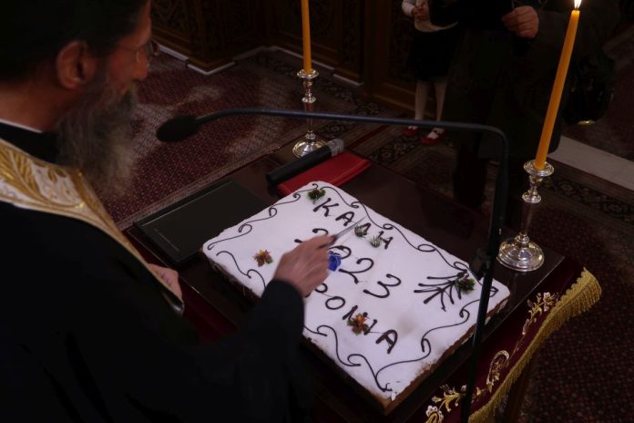 2.Ακολουθία ευλογίας της βασιλόπιτας, στην οποία έψαλε η βυζαντινή χορωδία του Ιερού Ναού υπό τη διεύθυνση του πρωτοψάλτη κ. Ιωάννου Βαζούρα.