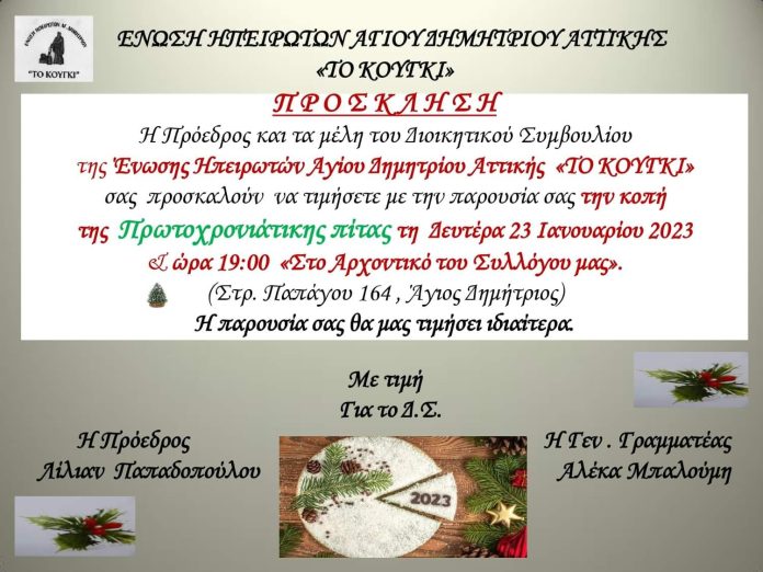Τη Δευτέρα 23 Ιανουαρίου θα πραγματοποιηθεί η κοπή της πρωτοχρονιάτικης πίτας της Ένωσης Ηπειρωτών Αγίου Δημητρίου Αττική “ΤΟ ΚΟΥΓΚΙ”.
