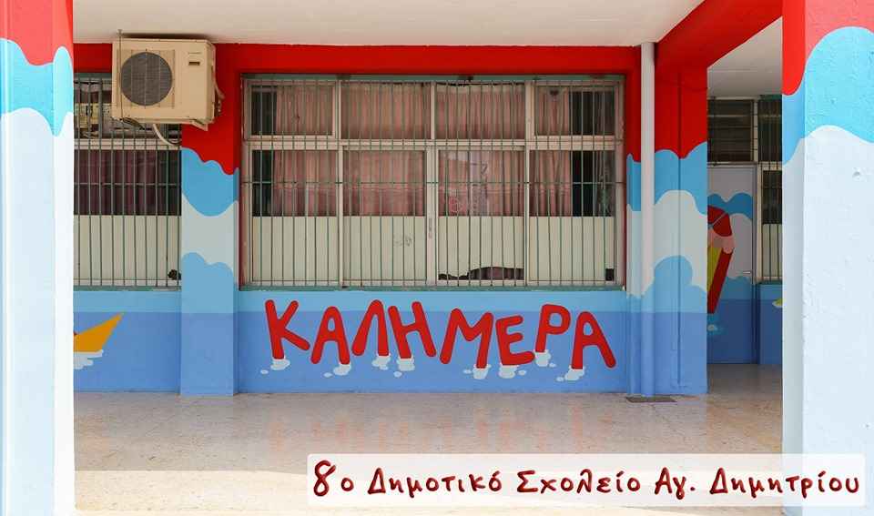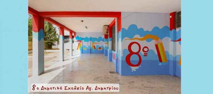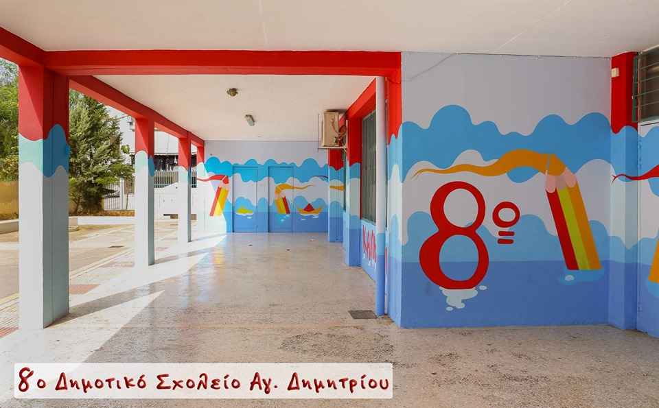 Όμορφα χρώματα και σχέδια διακόσμησαν τους εξωτερικούς τοίχους του 8ου Δημοτικού Σχολείου Αγίου Δημητρίου, που βρίσκεται στην οδό Ρόμπερτ Κένεντι 30. Οι εικαστικές παρεμβάσεις πραγματοποιήθηκαν στο πλαίσιο του προγράμματος αισθητικής αναβάθμισης των σχολικών κτιρίων.