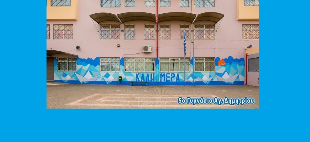 Ένα καραβάκι και μια καταγάλανη θάλασσα κόσμησαν την κύρια όψη και μεγάλο μέρος του προαύλιου χώρου του 5ου Γυμνασίου του Δήμου Αγίου Δημητρίου. Τις εικαστικές παρεμβάσεις πραγματοποίησε ο καλλιτέχνης Thano Raf.