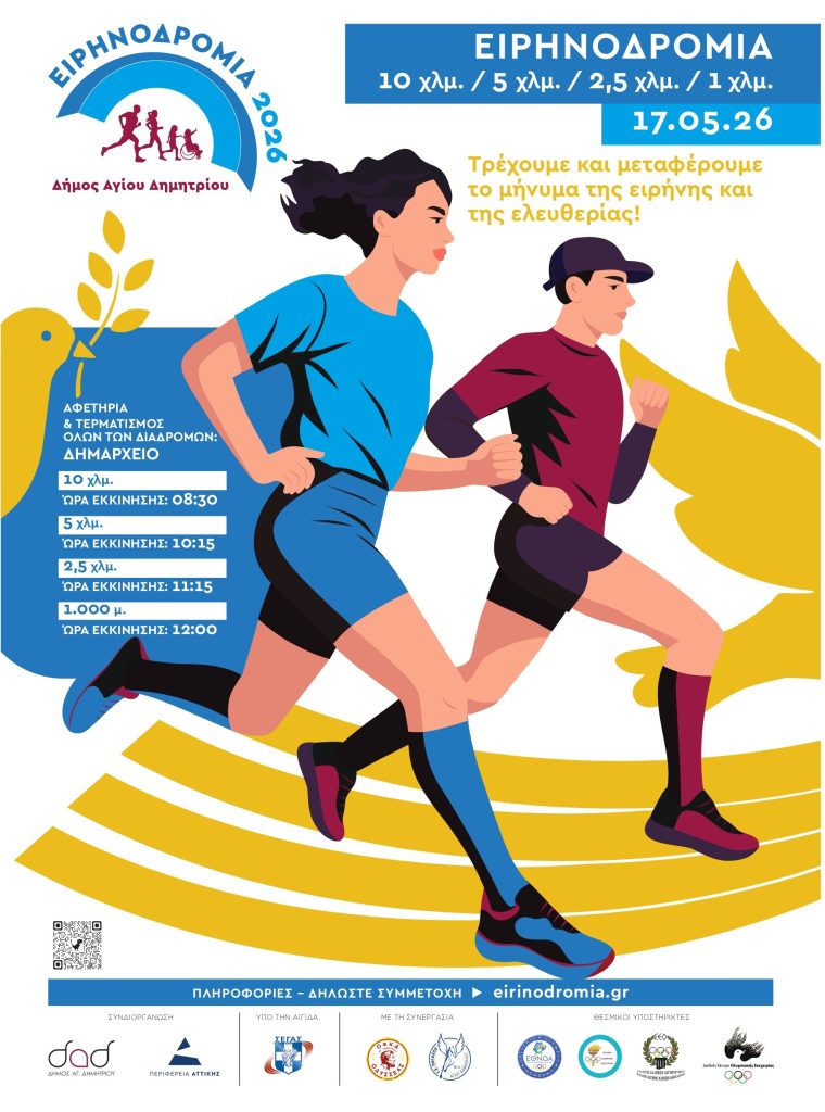 Το Τμήμα Αθλητισμού του Δήμου Αγίου Δημητρίου, με τον ΟΦΚΑ ΟΔΥΣΣΕΑΣ Αγίου Δημητρίου και τον Γ.Σ. Πήγασο Αγ. Δημητρίου, σε συνεργασία με την ΕΑΣ ΣΕΓΑΣ Πειραιά και με την υποστήριξη της Περιφέρεια Αττικής, στο πλαίσιο των εκδηλώσεων μνήμης για τον αγωνιστή της Δημοκρατίας, Αλέκο Παναγούλη, διοργανώνει και σας προσκαλεί στην Ειρηνοδρομία 2026, την Κυριακή 17 Μαΐου με σύνθημα “Τρέχουμε και μεταφέρουμε το μήνυμα της ειρήνης και της ελευθερίας”.