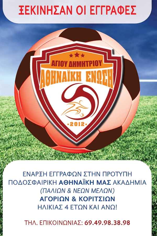 Η Πρότυπη Ποδοσφαιρική Ακαδημία «Αθηναϊκή Ένωση Αγίου Δημητρίου» ξεκίνησε τις εγγραφές της και μπορείτε να μάθετε περισσότερες πληροφορίες για τα μαθήματα καλώντας στο 694 9983 898 ή στο επίσημο site της ακαδημίας www.athensacademy.gr.
