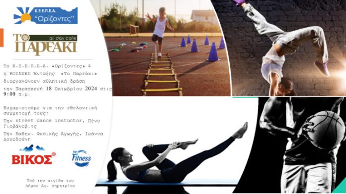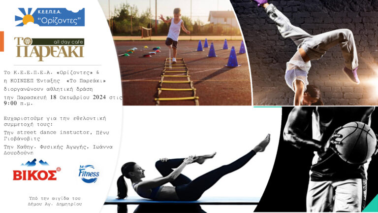 Το Κέντρο Ειδικής Εκπαίδευσης Παιδιών και Ενηλίκων με Αναπηρία (Κ.Ε.Ε.Π.Ε.Α.) «Ορίζοντες» και η Κοινωνική Συνεταιριστική Επιχείρηση (ΚΟΙΝΣΕΠ) Ένταξης «Το Παρεάκι» σας προσκαλούν στην  αθλητική δράση στην Πλατεία Παναγούλη στον Αγ. Δημήτριο, την Παρασκευή 18 Οκτωβρίου 2024. Ώρα έναρξης 9:00 π.μ.