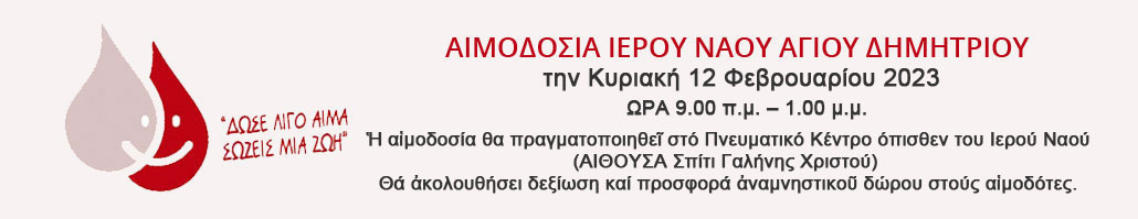Την Κυριακή 12 Φεβρουαρίου θα πραγματοποιηθεί η αιμοδοσία που διοργανώνει ο Ιερός Ναός Αγίου Δημητρίου στον Άγιο Δημήτριο. Η αιμοδοσία θα λάβει χώρα στο Πνευματικό Κέντρο πίσω από τον Ιερό Ναό (Αίθουσα Σπίτι Γαλήνης Χριστού).