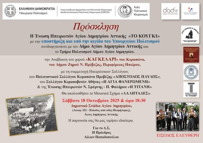 Η Ένωση Ηπειρωτών Αγίου Δημητρίου “Το Κούγκι” με την υποστήριξη και υπό την αιγίδα του Υπουργείου Πολιτισμού, συνδιοργανώνει με το Δήμο Αγίου Δημητρίου την αναβίωση του χορού “Καγκελάρι” του Κερασώνα, του δήμου Ζηρού, Ν. Πρέβεζας, το Σάββατο 18/10 στις 18:30 στο δημοτικό στάδιο Αγίου Δημητρίου.