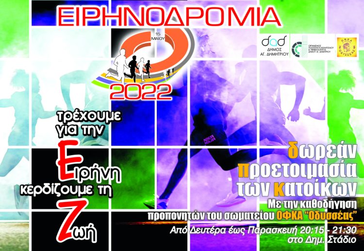 Δωρεάν πρόγραμμα προετοιμασίας, για άτομα που επιθυμούν να λάβουν μέρος στην Ειρηνοδρομία 2022 και νιώθουν ότι υστερούν σε φυσική κατάσταση, διοργανώνει ο Δήμος Αγίου Δημητρίου σε συνεργασία  το αθλητικό σωματείο ΟΦΚΑ ΟΔΥΣΣΕΑΣ.