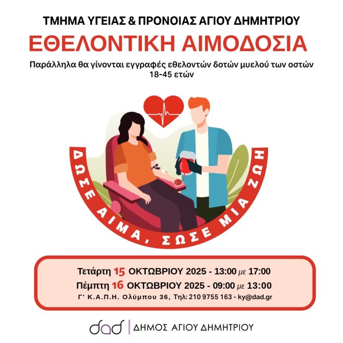 Δώσε αίμα, σώσε μια ζωή 15 & 16 Οκτωβρίου στο Γ’ ΚΑΠΗ (Ολύμπου 36) του Δήμου Αγίου Δημητρίου!