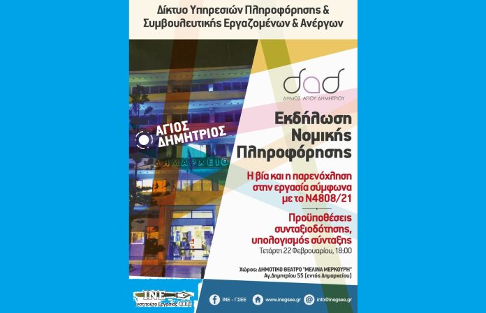 Στο πλαίσιο της συνεργασίας του Δήμου Αγίου Δημητρίου με το Ινστιτούτο Εργασίας της ΓΣΕΕ (ΙΝΕ/ΓΣΕΕ), διοργανώνεται εκδήλωση Νομικής Πληροφόρησης, με δύο θέματα που αφορούν όλες και όλους μας.