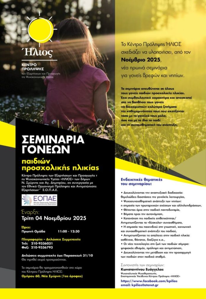 Το Κέντρο Πρόληψης Εξαρτήσεων ”ΗΛΙΟΣ” οργανώνει νέο Κύκλο Σεμιναρίων Γονέων με παιδιά στην προσχολική ηλικία, που αρχίζουν την Τρίτη 4 Νοεμβρίου 2025 (11:00 – 12:30) στο χώρο του κέντρου πρόληψης, Ομήρου 60, Νέα Σμύρνη.