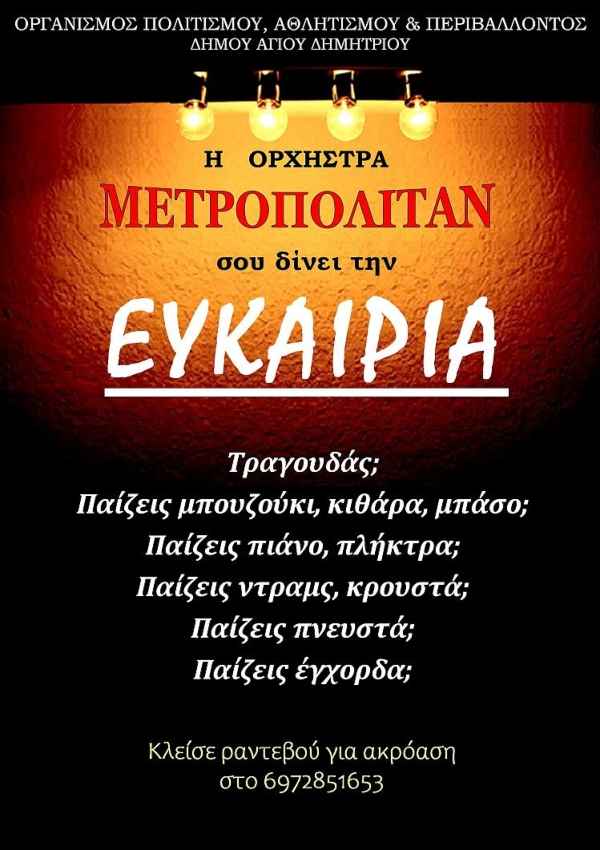 Αν τραγουδάς ή παίζεις μπουζούκι, κιθάρα, μπάσο, πιάνο, πλήκτρα, ντραμς, κρουστά, πνευστά ή έγχορδα, η ορχήστρα ΜΕΤΡΟΠΟΛΙΤΑΝ του Δήμου Αγίου Δημητρίου, σε βοηθάει να εκφραστείς καλλιτεχνικά συμπράττοντας μαζί της.