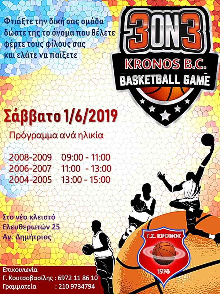 Συγκεκριμένα τα παιδιά που έχουν γεννηθεί τις χρονιές 2004-2005, 2006-2007 και 2008-2009 μπορούν να δημιουργήσουν τη δική τους ομάδα που θα απαρτίζεται από τρία άτομα και να κατέβουν στο νέο κλειστό γήπεδο στην οδό Ελευθερωτών 25 στον Άγιο Δημήτριο για να παίξουν μπάσκετ.