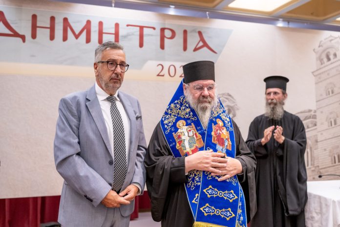 Στο τέλος της εκδήλωσης ο Δήμαρχος ευχαρίστησε τον Καθηγούμενο της Ιεράς Μεγίστης Μονής του Βατοπεδίου, Γέροντα Εφραίμ για τη συνεχή παρουσία του κάθε χρόνο στα «ΔΗΜΗΤΡΙΑ» και για το γεγονός ότι κόμισε στην πόλη μας την τιμία κάρα του Αγίου Γρηγορίου του Θεολόγου, η οποία φυλάσσεται στην Ιερά Μεγίστη Μονή του Βατοπεδίου και αποτελεί ιερό θυσαύρισμα της Μονής.