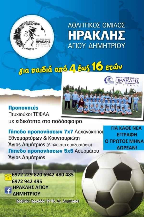 O Aθλητικός Όμιλος Hρακλής Αγίου Δημητρίου ξεκινάει τις αθλητικές του δράσεις για τη νέα σεζόν και ήδη έχουν αρχίσει οι εγγραφές.