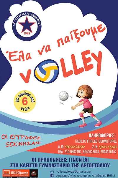 Οι εγγραφές στο τμήμα βόλεϊ για κορίτσια από 6 ετών και πάνω ξεκίνησαν για τον Γ.Σ. Αστέρας Αγίου Δημητρίου.