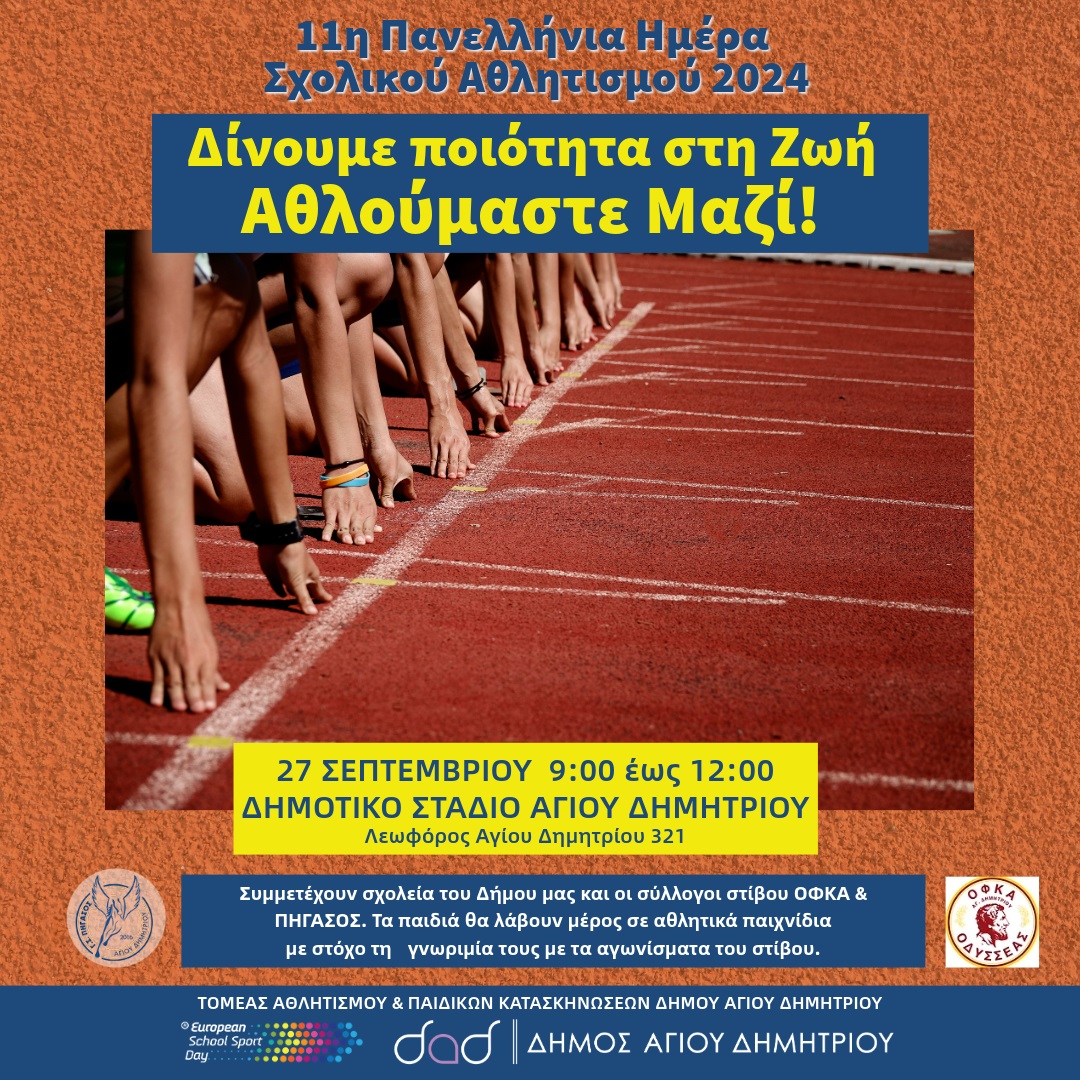 Την 11η Πανελλήνια ημέρα Σχολικού αθλητισμού θα γιορτάσει ο Δήμος Αγίου Δημητρίου στο Δημοτικό Στάδιο Αγίου Δημητρίου στις 27 Σεπτεμβρίου από τις 9:00 έως και τις 12:00.