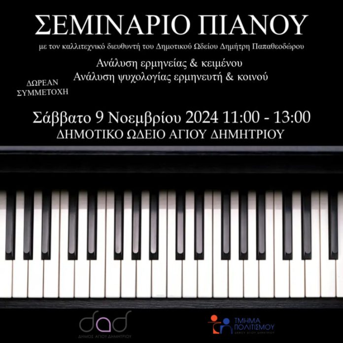 Το Τμήμα Πολιτισμού & Αθλητισμού του Δήμου Αγίου Δημητρίου, διοργανώνει το Σάββατο 9 Νοεμβρίου στις 11 π.μ. στη μεγάλη αίθουσα του Δημοτικού Ωδείου Αγίου Δημητρίου, σεμινάριο πιάνου με τον καλλιτεχνικό διευθυντή Δημήτρη Παπαθεοδώρου.