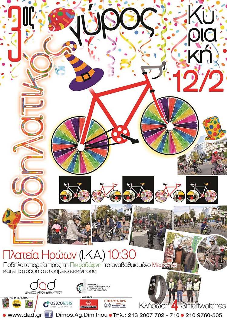 Ο Δήμος Αγίου Δημητρίου σε συνεργασία με τον Οργανισμό Πολιτισμού Αθλητισμού και Περιβάλλοντος διοργανώνει άλλη μια, ιδιαίτερα αποκριάτικη, ποδηλατάδα, την Κυριακή 12 Φεβρουαρίου 2023 με σημείο εκκίνησης την πλατεία Ηρώων. Η ποδηλατοπορεία θα κινηθεί προς την Πικροδάφνη, θα συνεχίσει προς το αναβαθμισμένο Μεσονήσι για να επιστρέψει στο σημείο εκκίνησης όπου θα είναι και ο τερματισμός.