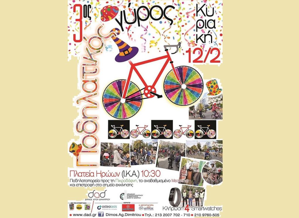 Ο Δήμος Αγίου Δημητρίου σε συνεργασία με τον Οργανισμό Πολιτισμού Αθλητισμού και Περιβάλλοντος διοργανώνει άλλη μια, ιδιαίτερα αποκριάτικη, ποδηλατάδα, την Κυριακή 12 Φεβρουαρίου 2023 με σημείο εκκίνησης την πλατεία Ηρώων. Η ποδηλατοπορεία θα κινηθεί προς την Πικροδάφνη, θα συνεχίσει προς το αναβαθμισμένο Μεσονήσι για να επιστρέψει στο σημείο εκκίνησης όπου θα είναι και ο τερματισμός.