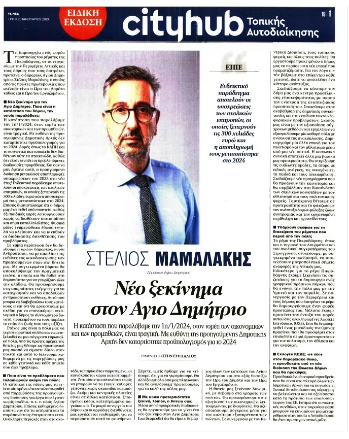 Συνέντευξη στην εφημερίδα τα Νέα παραχώρησε ο Δήμαρχος Αγίου Δημητρίου, Στέλιος Μαμαλάκης.