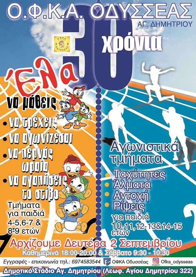 Πρόσκληση σε παιδιά από 4 έως και 15 ετών που επιθυμούν να ασχοληθούν με τον αθλητισμό και συγκεκριμένα με τον στίβο απευθύνει ο ΟΦΚΑ Οδυσσέας Αγίου Δημητρίου. Από τη Δευτέρα 2 Σεπτεμβρίου όσοι επιθυμουν μπορούν να απευθυνθούν στα γραφεία του τα οποία θα είναι ανοιχτά καθημερινά από τις 18:00 έως τις 20:00 και το Σάββατο από τις 9:30 έως τις 10:30.