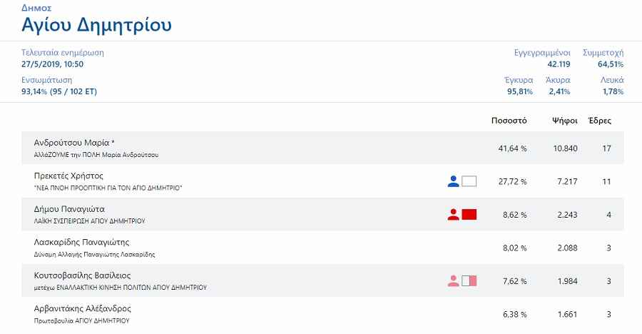 Πρώτη αναδείχτηκε η Μαρία Ανδρούτσου με ποσοστό 41,64% στον πρώτο γύρο των δημοτικών εκλογών με ενσωμάτωση 93,14%. Συγκεκριμένα ο συνδυασμός της «ΑλλάΖΟΥΜΕ την Πόλη – Μαρία Ανδρούτσου» απέσπασε 10.840 ψήφους και 17 έδρες. Δεύτερος αναδείχτηκε ο Χρήστος Πρεκετές με ποσοστό 27,72%, 7.217 ψήφους. Το αποτέλεσμα θα κριθεί στον δεύτερο γύρο των δημοτικών εκλογών την Κυριακή 2 Ιουνίου.