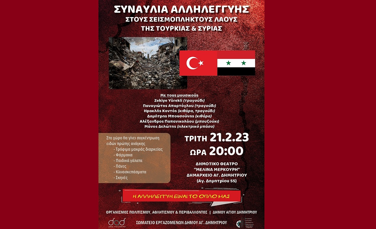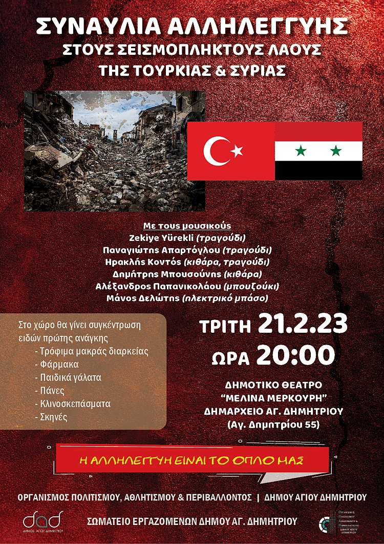 Ο Οργανισμός Πολιτισμού, Αθλητισμού & Περιβάλλοντος και το Σωματείο Εργαζομένων του Δήμου Αγίου Δημητρίου διοργανώνουν συναυλία αλληλεγγύης για τους σεισμόπληκτους λαούς της Τουρκίας και της Συρίας, την Τρίτη 21-2-2023 και ώρα 20:00, στο Δημοτικό Θέατρο “Μελίνα Μερκούρη” (Αγίου Δημητρίου 55).