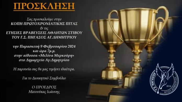 Ο Γυμναστικός Σύλλογος ΠΗΓΑΣΟΣ Αγίου Δημητρίου σας προσκαλεί, την Παρασκευή 9 Φεβρουαρίου στις 7 μ.μ., στην Κοπή της Πρωτοχρονιάτικης πίτας και τις Βραβεύσεις των κορυφαίων αθλητών στίβου του συλλόγου για το 2023 , στην αίθουσα “Μελίνα Μερκούρη” του Δημαρχείου Αγίου Δημητρίου.