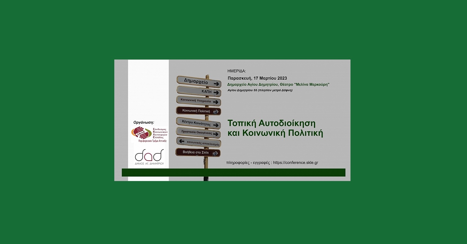 Το Περιφερειακό Τμήμα του Συνδέσμου Κοινωνικών Λειτουργών Ελλάδας (ΝΠΔΔ) Αττικής και ο Δήμος Αγίου Δημητρίου, συνδιοργανώνουν επιστημονική ημερίδα με θέμα “Τοπική Αυτοδιοίκηση και Κοινωνική Πολιτική”.
