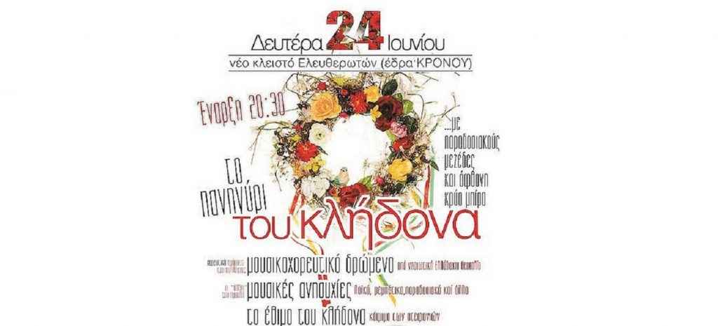 Στο νέο κλειστό Ελευθερωτών θα πραγματοποιηθεί τη Δευτέρα 24 Ιουνίου το πανηγύρι του Κλήδονα στη “+οικία” Άγιος Σπυρίδωνας. Το μενού θα περιλαμβάνει παραδοσιακούς μεζέδες, άφθονη μπύρα και φυσικά χορό!