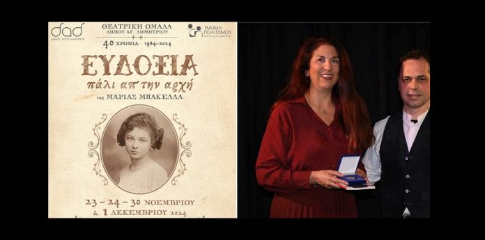 Τιμητική διάκριση για το έργο “ΕΥΔΟΞΙΑ – Πάλι απ’ την Αρχή” της Μαρίας Μπακέλλα, που παρουσιάστηκε πρόσφατα στο Θέατρο Μελίνα Μερκούρη από τη Θεατρική Ομάδα του Δήμου Αγίου Δημητρίου, η οποία συμπληρώνει φέτος 40 χρόνια θεατρικής δημιουργίας και προσφοράς.