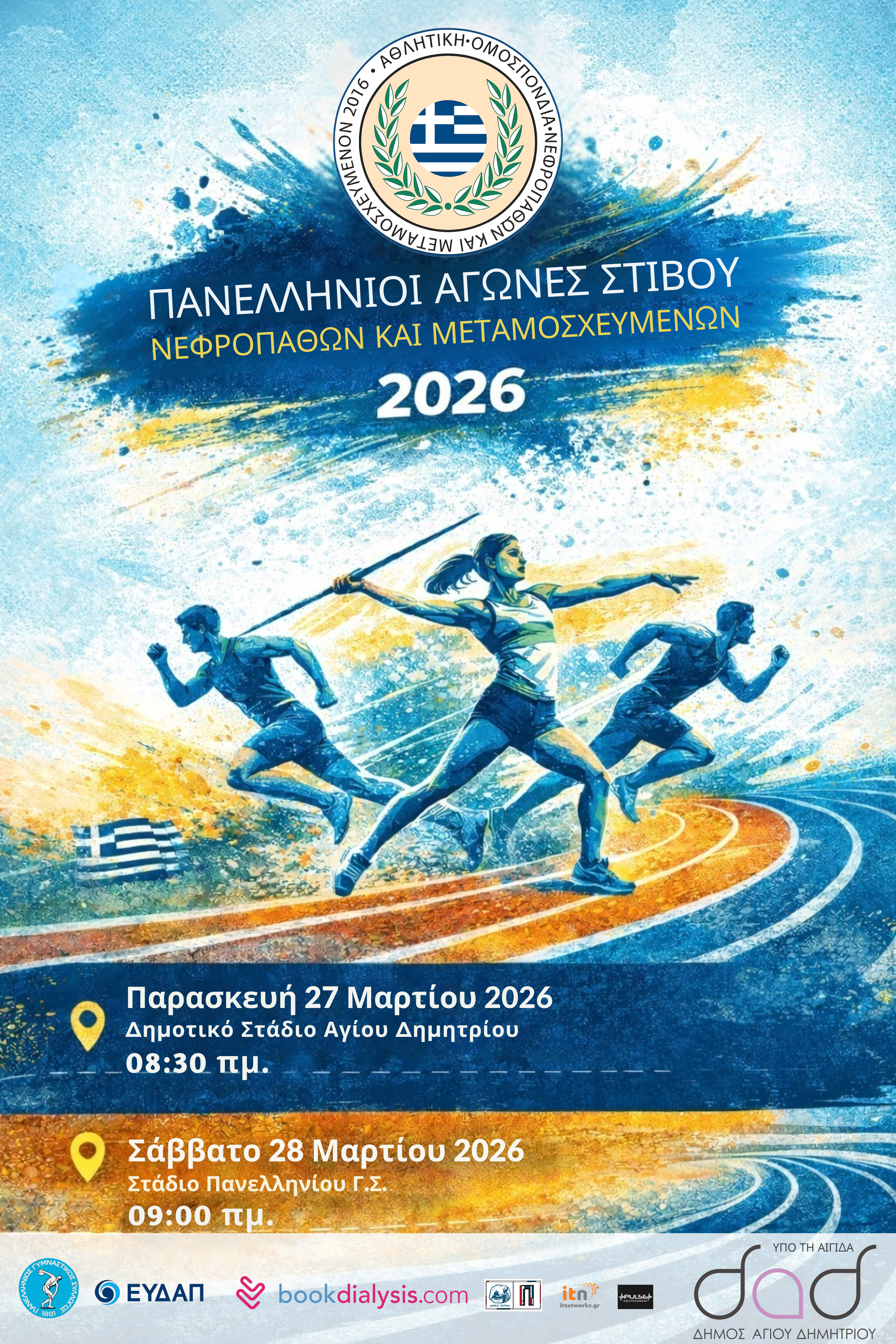 Ειδικότερα, την Παρασκευή 27/3/26 & ώρα: 8:30 το πρωί και 16:00 το απόγευμα, στο Δημοτικό Στάδιο Αγ. Δημητρίου, υπό την αιγίδα του Δήμου Αγ. Δημητρίου, οι αθλητές μας, προκειμένου να κριθεί η πρόκριση τους για την συμμετοχή τους στην Εθνική Ομάδα που θα μεταβεί στο Πανευρωπαϊκό Πρωτάθλημα Μεταμοσχευμένων και Αιμοκαθαιρόμενων, στο Άρνεμ της Ολλανδίας, το διάστημα 20-26/6/26, εκπροσωπώντας τη χώρα μας, θα λάβουν μέρος στα παρακάτω αθλήματα: