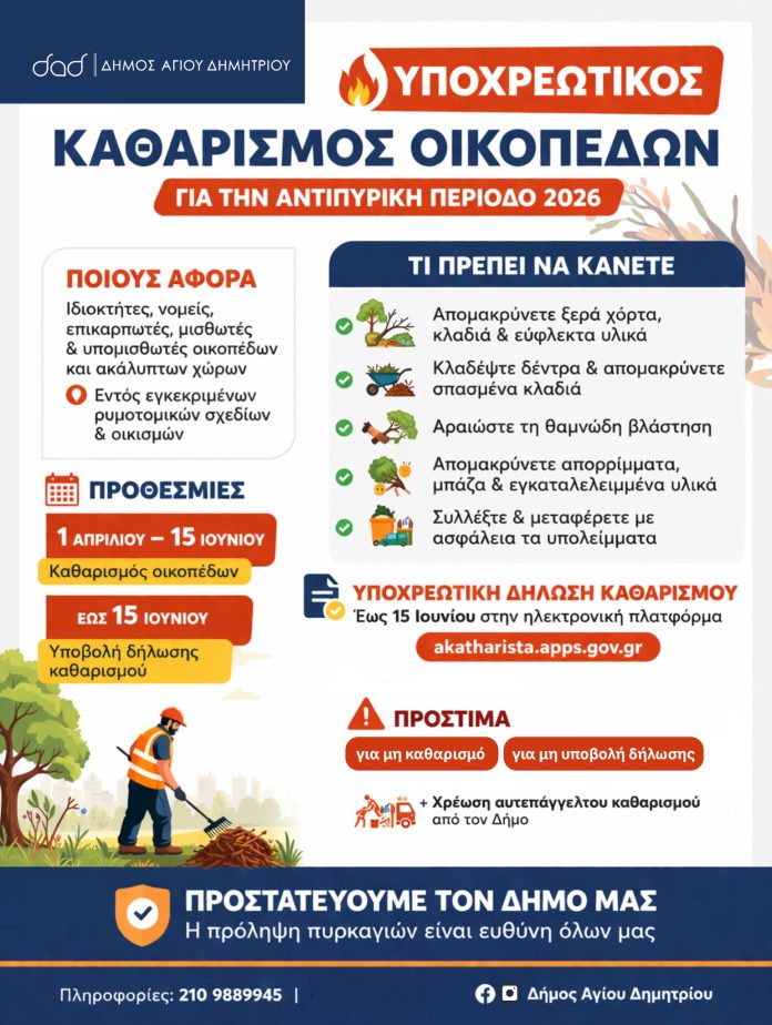 Ο Δήμος Αγίου Δημητρίου υπενθυμίζει στους πολίτες, ότι σύμφωνα με το ισχύον θεσμικό πλαίσιο, είναι αναγκαίο να μεριμνήσουν για τον καθαρισμό των οικοπέδων, με στόχο την προστασία της πόλης μας κατά την αντιπυρική περίοδο του 2026. Σύμφωνα με την υπ’ αρ. 20/2024 Πυροσβεστική Διάταξη και τον νόμο 5281/2026 (αρθ. 41 και 43 του), όλοι οι ιδιοκτήτες, νομείς, επικαρπωτές και μισθωτές οικοπέδων και ακάλυπτων χώρων εντός σχεδίου πόλεως, οφείλουν να μεριμνήσουν άμεσα για τον καθαρισμό των ιδιοκτησιών τους. Η διαδικασία αυτή είναι υποχρεωτική, καθώς η πρόληψη των πυρκαγιών αποτελεί συλλογική ευθύνη που αφορά στην ασφάλεια της ζωής και των περιουσιών όλων των κατοίκων.