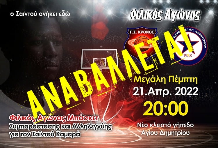 ΑΘΛΗΤΙΚΑΕΙΔΗΣΕΙΣΚΟΙΝΩΝΙΚΑ Αναβάλλεται ο αγώνας μπάσκετ για συμπαράσταση στον Σαϊντού Καμαρά 18 Απριλίου 2022 555 Facebook Google+ Τελευταια ενημέρωση:20/4 ΑΝΑΒΑΛΛΕΤΑΙ ο φιλικός αγώνας συμπαράστασης και αλληλεγγύης στον Σαϊντού Καμαρά που είχε ορισθεί για την Μ. Πέμπτη 21/4/2022 λόγω επιβεβαιωμένων κρουσμάτων COVID19