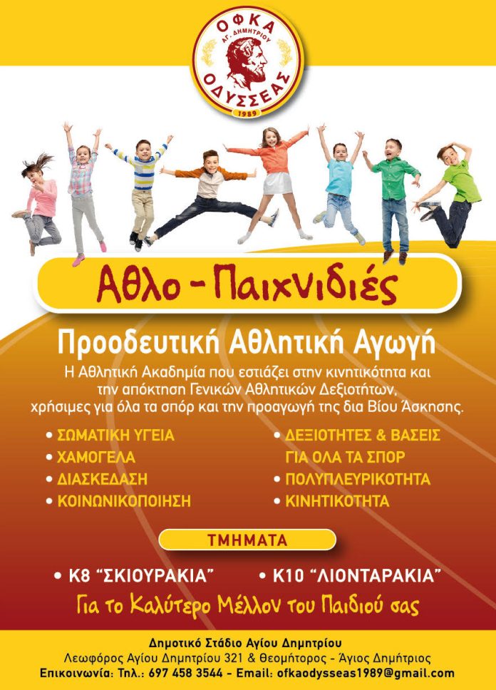 Οι Ακαδημίες του ΟΦΚΑ Οδυσσέας Αγίου Δημητρίου έχουν τρία τμήματα για παιδιά από 4-14 ετών και θα λειτουργούν καθημερινά στο Δημοτικό Στάδιο Αγ. Δημητρίου από τις 17:00. Κάθε τμήμα μετρά περιορισμένο αριθμό παιδιών με έναν έμπειρο προπονητή ή προπονήτρια απόφοιτο/η Τ.Ε.Φ.Α.Α ανά 20 παιδιά το μέγιστο.