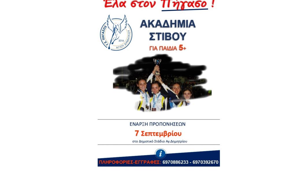 Τη Δευτέρα 7 Σεπτεμβρίου ξεκινούν οι προπονήσεις στην Ακαδημία Στίβου του Γ.Σ. Πήγασος στο Δημοτικό Στάδιο Αγίου Δημητρίου σύμφωνα με σχετική ανακοίνωση.