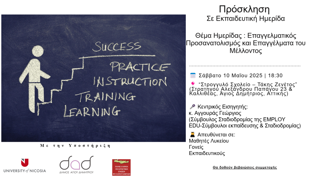 Κεντρικός ομιλητής θα είναι ο κ. Αγγουράς Γεώργιος, Σύμβουλος Σταδιοδρομίας της EMPLOY EDU – Σύμβουλοι Εκπαίδευσης και Σταδιοδρομίας, με πολυετή εμπειρία στην επαγγελματική καθοδήγηση νέων και την ανάλυση των τάσεων στην αγορά εργασίας.