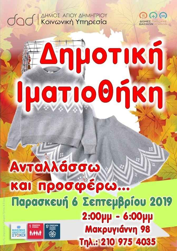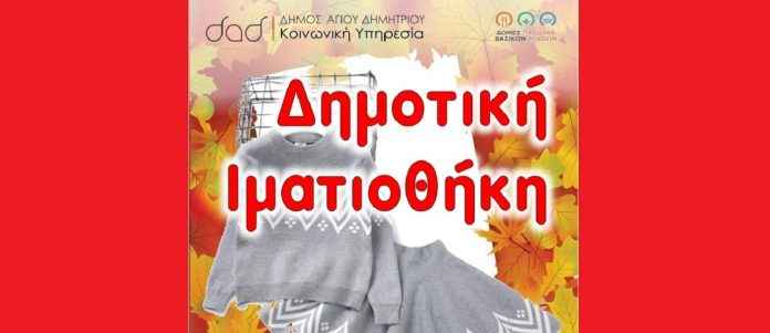 Τη δυνατότητα να ανταλλάξουν και να προσφέρουν ρούχα, παπούτσια, αξεσουάρ και παιδικά παιχνίδια θα έχουν οι πολίτες καθώς η Δημοτική Ιματιοθήκη του Δήμου Αγίου Δημητρίου ανοίγει τις πόρτες της και φέτος το φθινόπωρο.Την Παρασκευή 6 Σεπτεμβρίου η Δημοτική Ιματιοθήκη επί της οδού Μακρυγιάννη 98, θα παραμείνει ανοιχτή από τις 14:00 έως τις 18:00.