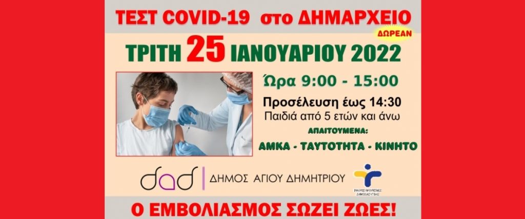Συνεχίζονται τα τεστ ανίχνευσης κρουσμάτων κορωνοϊού την Τρίτη 25 Ιανουαρίου 2022 και από ώρα 9:00 έως 15:00 (προσέλευση έως 14:30) από κινητή μονάδα του ΕΟΔΥ που θα βρίσκεται έξω από το Δημαρχείο Αγίου Δημητρίου (Αγίου Δημητρίου 55).