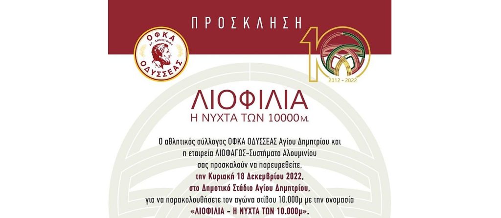 O αθλητικός σύλλογος ΟΦΚΑ Οδυσσέας Αγίου Δημητρίου και η εταιρεία ΛΙΟΦΑΓΟΣ – Συστήματα Αλουμινίου σας προσκαλούν να παρευρεθείτε την Κυριακή 18 Δεκεμβρίου 2022 στο Δημοτικό Στάδιο Αγίου Δημητρίου για να παρακολουθήσετε τον αγώνα στίβου 10.000μ. με την ονομασία «Λιοφίλια-Η νύχτα των 10.000μ».