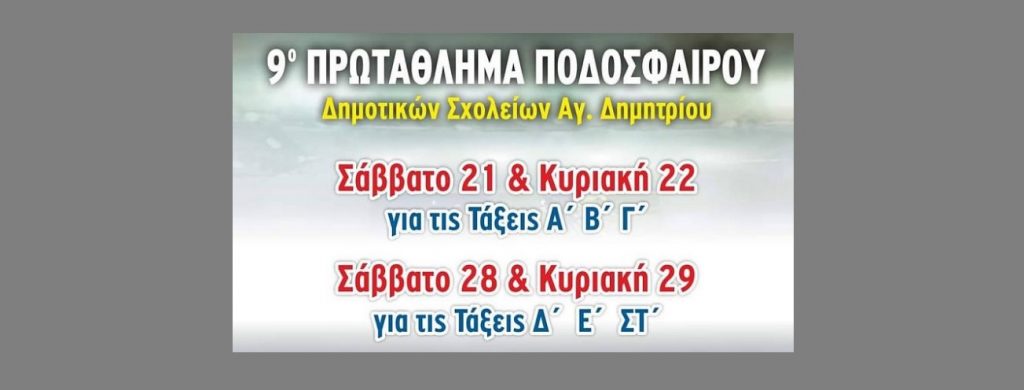 Η Ένωση Συλλόγων Γονέων & Κηδεμόνων, σε συνεργασία με τον Οργανισμό Πολιτισμού, Αθλητισμού & Περιβάλλοντος του Δήμου Αγίου Δημητρίου, διοργανώνουν το 9ο Πρωτάθλημα Ποδοσφαίρου Δημοτικών Σχολείων.